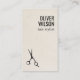 Modern fully customizable business card template. Printed texture beige background, black scissors icon and bold fonts.