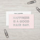 Una cita moderna del estilo de moda Hair Stylist " La felicidad es un buen día para el cabello " una gran tipografía con efecto Relieve metalizado. Un recordatorio a los clientes futuros y actuales de que un gran corte de pelo puede hacerte feliz. Añade la información de contacto y el nombre de usuario al dorso (siéntase libre de hacerlo sencillo y borre cualquier cosa que no necesite). Los iconos de los medios sociales en la parte de atrás se pueden mover, reducir y/o cambiar de color. También disponible en formato cuadrado. Arte original ©Marisu Valencia en Marisu Paper Co.