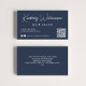 tarjeta de presentación azul de moda que muestra su nombre o marca en un guión moderno de firma blanca y su tipo de negocio o título en letras blancas limpias. Ingresa tu dirección de sitio web para crear un código QR que los clientes y clientes puedan escanear para obtener una lista de tus productos, servicios, horas, etc., y agrega tus datos de usuario de instagram y facebook para que los clientes los sigan y se conecten contigo en los medios sociales. Agregue información adicional en la parte posterior o déjela en blanco.