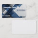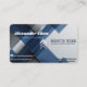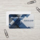 A sleek, professional business card template featuring a dynamic composition of layered diagonal shapes in navy blue and brushed silver on a clean white background.