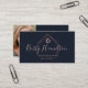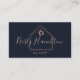 Elegante y profesional agencia inmobiliaria tarjeta de visita con una foto en la parte trasera. Logo moderno de realtor en el frente con letra de guión en rosa rubor y fondo en color azul marino.