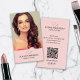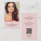 Cree una tarjeta profesional y moderna con una foto personalizado en la parte delantera y detalles personalizados, además de un escaneado código QR en la parte posterior para facilitar el trabajo en red, e iconos editables en los medios sociales. Ajusta fácilmente las fuentes, los colores, el fondo y el diseño para que coincidan perfectamente con el estilo. Ideal para maquilladores, peluqueros, Salón de belleza y negocios que buscan ofrecer una presentación cuidada y profesional.