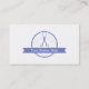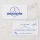 Una tarjeta de visita moderna y elegante que se centra en un logotipo como el diseño con un círculo de borde de vieira que contiene el contorno de silueta de un par de tijeras. Agregue su nombre comercial en el espacio de banners. En el reverso de la tarjeta de visita están las tijeras y el peine y las líneas punteadas para el nombre y el título del trabajo. Ideal para barberos, peluqueros, peluqueros, peluqueros a los que les gusta la distribución limpia de las tarjetas de visita. Paleta de colores de espacios negativos en blanco y azul.