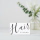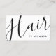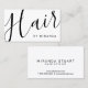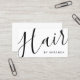 Tarjeta de presentación profesional moderna con estilo de color negro y blanco, que incluye la palabra "cabello" en el estilo moderno de letra caligrafía en el lado frontal y detalles en el estilo moderno de letra sans serif en el reverso. Perfecto para estilistas, salón de belleza y muchas otras profesiones.