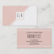 Tarjetas de visita de arquitecto geométrico moderno rosa y blanco Rubor con monograma. La parte delantera incluye dos franjas diagonales, una rosa y otra blanca que separan la tarjeta en dos triángulos.
