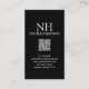 Modernas tarjetas comerciales QR Code con un diseño sencillo y mínimo en negro con tu monograma en negrita junto con tu nombre en la parte superior. Debajo está tu información de contacto.