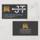 Una cubierta gris oscuro presenta un marco de borde de carteles que tiene su prestigioso nombre con las iniciales de monograma justo detrás. A la izquierda de este, tienes un logotipo de semi camión dorado que puedes usar con el nombre de negocio azul y los datos de contacto directamente debajo. Al dorso, el logotipo del camión dorado está en la parte superior seguido de tu prestigioso nombre, los detalles de contacto y un pie de foto de un lema para publicitar tu negocio. Una tarjeta hecha para que todos usen temas de transporte.