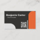 Haga una impresión audaz y profesional con un diseño elegante de tarjetas de visita. Con un dinámico esquema de color negro, blanco y naranja, combina el estilo moderno con un fuerte impacto visual. En la parte frontal se resalta el nombre, el título y el escaneado código QR para facilitar las conexiones digitales, mientras que en la parte posterior se proporciona un espacio claro para los detalles de la empresa y la información de contacto. Perfecto para emprendedores, ejecutivos, consultores y profesionales que desean una herramienta de trabajo en red contemporánea y memorable.