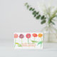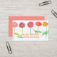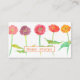 Una alegre tarjeta de visita decorada con cinco flores de zinnia en tonos rojos, rosas, naranjas y violetas pintadas con acuarela y toques de salpicaduras en el fondo para añadir color. En el lenguaje de las flores, los zinnias significan pensamientos de amigos ausentes. Colores atractivos para el trabajo en red y la promoción de su negocio.