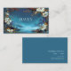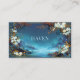 Define your brand with the magical elegance and celestial mystery of an exclusive destination using this captivating business card. The design centers on a spectacular nocturnal waterscape, dominated by a wide, calm lake reflecting the deep starry midnight blue sky. The backdrop features jagged, misty blue mountains and a tranquil valley, all framed by a thin, metallic gold rectangular border. The entire scene is lavishly framed by lush white roses and vibrant copper-toned foliage that glow with subtle starlight, creating a brilliant contrast against the dark atmosphere. This artwork blends cinematic, magical realism with opulent, sophisticated florals, making your card truly unforgettable. This business card is ideally suited for a high-end event stylist specializing in fantasy or twilight-themed galas, a boutique travel agency promoting exclusive, hidden destinations, or a fine jewelry designer showcasing gold and star-themed pieces. It would also perfectly suit a fantasy novelist or game developer seeking distinctive, narrative-driven branding, or a luxury hotelier wanting to convey a magical, serene setting.