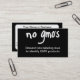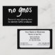 Esta tarjeta de visita le ayudará a promover alimentos saludables y el medio ambiente sin productos de gmo. Diga su opinión sobre los alimentos modificados genéticamente. Esta tarjeta de visita tiene texto blanco sobre fondo negro para llamar la atención. Ideal para eventos y reuniones para promover alimentos seguros y el medio ambiente. Los alimentos genéticamente modificados están prohibidos en la Unión Europea, pero se venden en los Estados Unidos sin etiquetarlos. Muestra tus sentimientos y preocupaciones diciendo "No a los OGM". Algunos estados están empezando a requerir etiquetas, pero la mayoría no lo están en este momento. Personalizable completo para su nombre y dirección u otra información de contacto en el reverso. Puede personalizar de su propio texto para cambiarlo, eliminarlo o agregarlo.