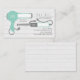 Una tarjeta de visita estilista con el ilustracion de un verde azulado secado por soplo y rizado con espacios para la fecha y hora de la próxima cita sobre un fondo de madera gris. Personalice el texto.