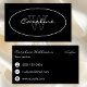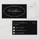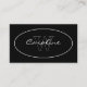 Una tarjeta de visita con un diseño sencillo y elegante en blanco sobre negro con un nombre y un monograma en un óvalo en la parte delantera y la información de contacto en la parte posterior.