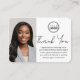 Expresar gratitud a los clientes con tarjetas de visita de agradecimiento personalizadas. Una manera perfecta de mostrar su aprecio e invitar a futuras colaboraciones. Este diseño moderno muestra tu foto, junto con elegantes letras de guiones. Una plantilla de doble cara, personalizada con su logotipo, un mensaje personal, sus credenciales y un código QR. Incluya una nota amistosa de los clientes motivadores para conectarse a un sitio de revisión y dejar comentarios. Ideal para notario público, agente de firma de préstamos, notario certificado de entrega de confianza, CNTDA, notario móvil, servicio de apostilla u otra profesión legal. Colores impresos: dorado, negro y blanco. Ver la colección en línea para más ideas y suministros de productos populares, diseñados para notarios!