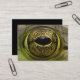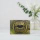 Esta tarjeta de intercambio de artistas muestra el cierre de un ojo de rana verde mientras flota en el estanque en un caluroso día de verano. Su iris es un increíble patrón abstracto de oro y amarillo. El puro alumno oval negro del centro refleja los árboles a lo lejos.