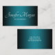 La imagen presenta un color negro y verde azulado oscuro o degradado. Nombre o negocio en un glamoroso tipo de letra moderna de caligrafía, aunque puede cambiar ese estilo. El título del trabajo y la información del contrato creados usando Bloq Mayús... todos los mayúsculas. Se aplica un espaciado de caracteres que es personalizable. Para los emprendedores en línea, personalizar y añadir más o menos que número de teléfono y medios sociales y/o sitio web. Para los profesionales hay espacio para una dirección física y otra información.