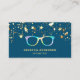 Tarjeta profesional optometrista con hermosas estrellas doradas confeti con falsos acentos de Relieve metalizado dorado sobre un fondo azul. Añade tu nombre y datos de contacto para hacer una primera impresión duradera.