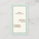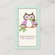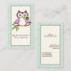 Búho de primavera curtido en una rama con tarjetas de negocios de borde de manta verde menta, con una linda lechuza de primavera en morado y marrón oscuro sosteniendo una flor en su pico (billete) en una rama con hojas verdes en el borde de yeso verde a menta. Un diseño adorable, femenino y decorativo para los amantes de las lechuzas. Obra de arte de Trina Clark.