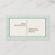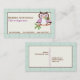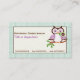 Búho de primavera curtido en una rama con tarjetas de negocios de borde de manta verde menta, con una linda lechuza de primavera en morado y marrón oscuro sosteniendo una flor en su pico (billete) en una rama con hojas verdes en el borde de yeso verde a menta. Un diseño adorable, femenino y decorativo para los amantes de las lechuzas. Obra de arte de Trina Clark.