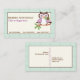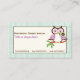 Búho de primavera curtido en una rama con tarjetas de negocios de borde de manta verde menta, con una linda lechuza de primavera en morado y marrón oscuro sosteniendo una flor en su pico (billete) en una rama con hojas verdes en el borde de yeso verde a menta. Un diseño adorable, femenino y decorativo para los amantes de las lechuzas. Obra de arte de Trina Clark.