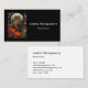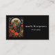 Business card with a cool looking owl with a piercing stare. A full moon in the back with a garden of red flowers.
