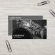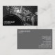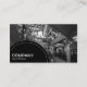 Una plantilla de tarjeta de visita con un panel semicircular negro decorado con una línea punteada blanca en la parte inferior izquierda para el nombre de la Compañía y el tipo de negocio. El panel semicircular se coloca sobre un fondo de foto o de arte (que también se puede cambiar). Nombre y otros datos de contacto en el reverso.