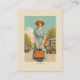 Un encantador ilustracion vintage de una mujer con un vestido azul polka-dot y un sombrero de sol, con una maleta de cuero en una calle empedrada parisina, rodeada de flores florecientes y tiendas clásicas.