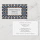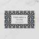 Una tarjeta de visita profesional residencial y comercial con suelo de baldosa y suelo con un fondo de patrón geométrico.