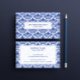 Elegante diseño de damasco floral azul real y blanco hermoso vintage con una tipografía de personalizable azul real.