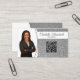 Un falso purpurina plateado inicia el fondo de este diseño de tarjeta de visita con un marcador de foto a la izquierda con el nombre de la plantilla a la derecha. La parte posterior incluye un diseño coordinado y colores con campos de texto para el nombre comercial y los detalles. Reemplace la foto del marcador de posición con su fotografía de formato vertical y su código QR en la parte delantera. Rellene los campos de la plantilla o haga clic en personalizar para seleccionar un estilo de fuente, tamaño y color que desee.La foto del marcador de posición es cortesía de pixabay.com.