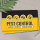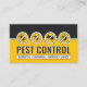 Striking pest control business card design featuring bold black and yellow colors with hazard-style insect icons and clear service info.