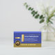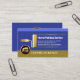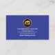 Al dorso, en una cubierta azul, el logotipo de la casa dorada está en la parte superior seguido de tu prestigioso nombre, los detalles de contacto y un pie de foto para publicitar tus servicios.