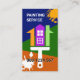 La cubierta incluye una casa colorida hecha en un pincel de pintura con salpicaduras de pintura amarilla y blanca. En la parte superior está el nombre comercial "SERVICIO DE PINTURA" que puede cambiar con el contacto telefónico cerca de la base. Al dorso, en una cubierta blanca, los detalles de la tarjeta se encuentran en la esquina inferior derecha. En la parte superior hay un logotipo de "fan chart de pintura casera" que se puede utilizar. A esto le sigue su prestigioso nombre, los datos de contacto y una opción de slogan para publicitar sus servicios. Una gran tarjeta para pintores y prácticos.