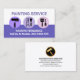 Cubierta monocromática púrpura con un diseño de herramientas de pintura cerca del centro. En la parte superior está tu nombre de negocio con los datos de contacto cerca de la base de la tarjeta. Al dorso, en una cubierta blanca, en la parte superior hay un logotipo de pincel de rodillo dorado que se puede usar. A esto le sigue su prestigioso nombre, los datos de contacto y un pie de foto para publicitar sus servicios. Un diseño sencillo y creativo para los pintores.