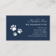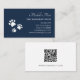 Mascota de código QR Sitter tarjeta de visita azul marino, con diseño de huella de pata y tipografía en blanco y negro. Con texto de personalizable, puede agregar su propia información. La parte posterior tiene un código QR donde se agrega su sitio web. Ideal para añadir un toque profesional a su negocio de servicios mascotas.