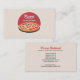 Una tarjeta de visita para su restaurante pizzería, camión de comida, servicio de entrega a domicilio o cocinero. Se compone de una pizza con pepperoni, aceitunas y albahaca colocada sobre una tabla de madera y un semicírculo rojo. En la parte trasera hay información completa sobre el personalizable, incluyendo horarios de apertura.