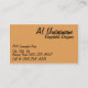 Delantera vertical con la parte posterior horizontal. Un diseño con patrones intrincados que incluye tres barras verticales a lo largo del borde vertical superior de esta tarjeta de visita es el personalizable. El diseño con estampado está en los colores de la puesta de sol del desierto de henna, naranja quemado y negro. Personalice el texto, elimine cualquier texto o utilice la herramienta de diseño de edición para seleccionar el estilo de fuente, el tamaño y el color que prefiera.