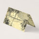 Tarjetas de visita personalizado dobladas con escritura retro y letras en bloque sobre un grabado tropical de palmeras en una playa de arena y hermosas nubes sobre olas oceánicas tranquilas en un falso paisaje de fondo.