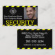 Esta tarjeta de visita presenta un diseño profesional con un título de "SEGURIDAD" impreso en amarillo brillante en la parte inferior sobre un fondo negro. A la derecha se coloca una foto de un guardián de seguridad de ejemplo que puede personalizar para incluir su propio ID de foto. A la izquierda se coloca un logotipo de empresa o empresa de ejemplo, seguido de un nombre de empleado y de empresa. La información de la empresa de seguridad o de la empresa y la información de contacto se colocan en la parte posterior. Una franja de precaución brillante con rayas amarillas y negras bordea las partes superior e inferior.