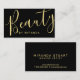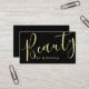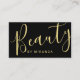 Tarjeta de presentación profesional moderna de artistas de maquillaje negro y oro con la palabra "belleza" en estilo moderno de letra caligrafía en el frente y detalles en estilo moderno de letra sans serif en el reverso. Perfecto para estilistas, salón de belleza y muchas otras profesiones. Atención: Los detalles del Relieve metalizado se simulan en la obra. Este producto no contará con ningún relieve ni capa que creen un efecto metalizado.