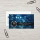 Esta tarjeta de visita de un corrector de temas oscuros presenta un icono cromado de un vidrio de papel encerrado en un círculo cromado sobre un fondo oscuro de luces de hielo de color azul. Su nombre comercial y el texto/eslogan aparecen dentro de una franja de panel de texto negro que se ejecuta desde el icono de la izquierda hacia el borde derecho de la tarjeta. El fondo de la tarjeta consiste en un patrón de fondo de temática oscura. Los datos de contacto aparecen en la parte inferior izquierda de la parte posterior de la tarjeta. Perfecto para la publicación, impresión, escritura, literatura, artes literarias, artísticas, profesionales, impactos, temas oscuros.