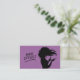 A hair stylist business card featuring silhouette of a hairdresser with a pair of scissors and a comb over a purple background. The back comes with full contact information on a pink background.