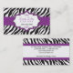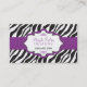 El estampado de zebra hace un fondo llamativo para un marco adornado en una cinta púrpura brillante del lunar en esta tarjeta de visita atención-que consigue. Un nombre comercial y un contacto principal se muestra en el marco rodeado por los ornamentos rizados. El revés revela toda la información de contacto entre los dos paneles del estampado de zebra acentuados con las cintas polca-punteadas violeta. Disponible en colores alternos con los productos a juego.
