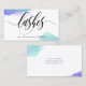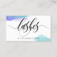 Una moda y una tarjeta de visita llamativa para un artista del latigazo con los latigazos escritos en una caligrafía negra magnífica script contra un fondo blanco salpicado con la acuarela de la púrpura y de la turquesa.