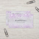 Una tarjeta de visita elegante y glamurosa sobre un fondo de color falso plateado decorado con un goteo de purpurina de lavanda en la parte delantera. Elegante guión de estilo con letras a mano negra. Personalice y agregue su nombre, título, número de teléfono, correo y dirección del sitio web.
