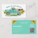 Una tarjeta de visita súper linda y mascota para mascotas, cuidado de mascotas, adopción de mascotas, hoteles mascotas, caminantes de perros, peluqueros, entrenadores de perros, guarderías y veterinarios. Elementos mascotas suaves y únicos de acuarela con gránulos de camión vintage y flor de girasol. Agregue la dirección URL de su sitio web comercial al reverso de la tarjeta, que actualizará el código QR (o elimine si no es necesario). Personalizar el nombre y los detalles de la empresa editando la plantilla de texto. Los iconos de los medios sociales pueden ser borrados si no es necesario - haga clic en personalizar/personalizar más para hacerlo.