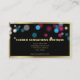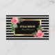Diseño moderno y elegante de tarjetas de visita personalizadas con un rectángulo negro con marco falso dorado adornado con dos rosas rosas rosas rosas sobre un fondo rayado en blanco y negro.El texto es completamente personalizable.