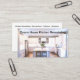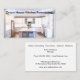 Plantilla de tarjetas de visita de construcción y remodelación con la imagen de una cocina recién remodelada en segundo plano y el nombre de la empresa que aparece en la parte delantera y sus detalles en la otra cara organizados para que pueda personalizar el diseño en línea. Usa nuestra imagen en nuestras tarjetas o reemplaza la imagen de la cocina con la tuya propia.