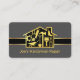 Una cubierta gris oscura incluye herramientas de mano dorada en casa con un borde rayado de oro. Cerca de la base está el nombre de negocio "HANDYMAN SERVICE" que puede cambiar. Al dorso, en una cubierta negra, los detalles de la tarjeta se encuentran a la izquierda con una herramienta dorada para la casa y un diseño de techo rojo. A continuación, su prestigioso nombre junto con los datos de contacto. Todas las letras están en oro falso. Una cubierta prestigiosa para el hombre de mano, los contratistas de construcción a usar.