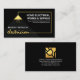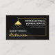 Una cubierta negra se acentúa con un simple diseño de cable eléctrico de oro con un letrero "electricista" de oro. El rayo de luz de la lámpara resalta tu prestigioso nombre con la señal de oro electricista justo debajo. En la esquina superior derecha está el nombre de la empresa y sus datos de contacto.